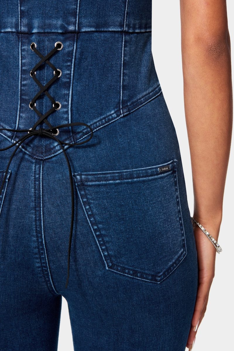 This denim jumpsuit features a zip-up entry. sweetheart seam details. and a skinny leg. Adjust the corset ties on the back waist for your perfect fit