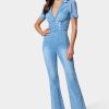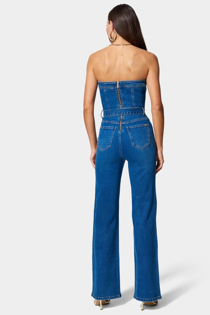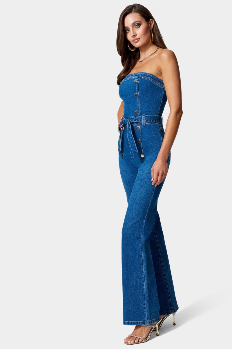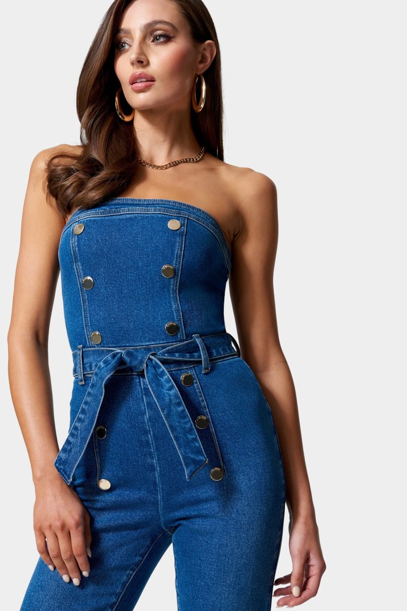 Made in our heritage denim fabric. this strapless jumpsuit features a double breasted button front and wide leg silhouette. Finished with a belted waist and back zipper for a customized fit.