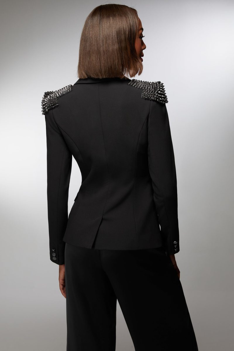 Elevate your power-dressing game with the bebe x Ciara tailored blazer. Crafted with a fearless attitude. this piece flaunts audaciously studded shoulders that make a bold statement. Its sleek double-breasted design commands attention. ensuring you’re not just in the room. you’re owning it. Perfect for those days (or nights) you want your look to scream boss.