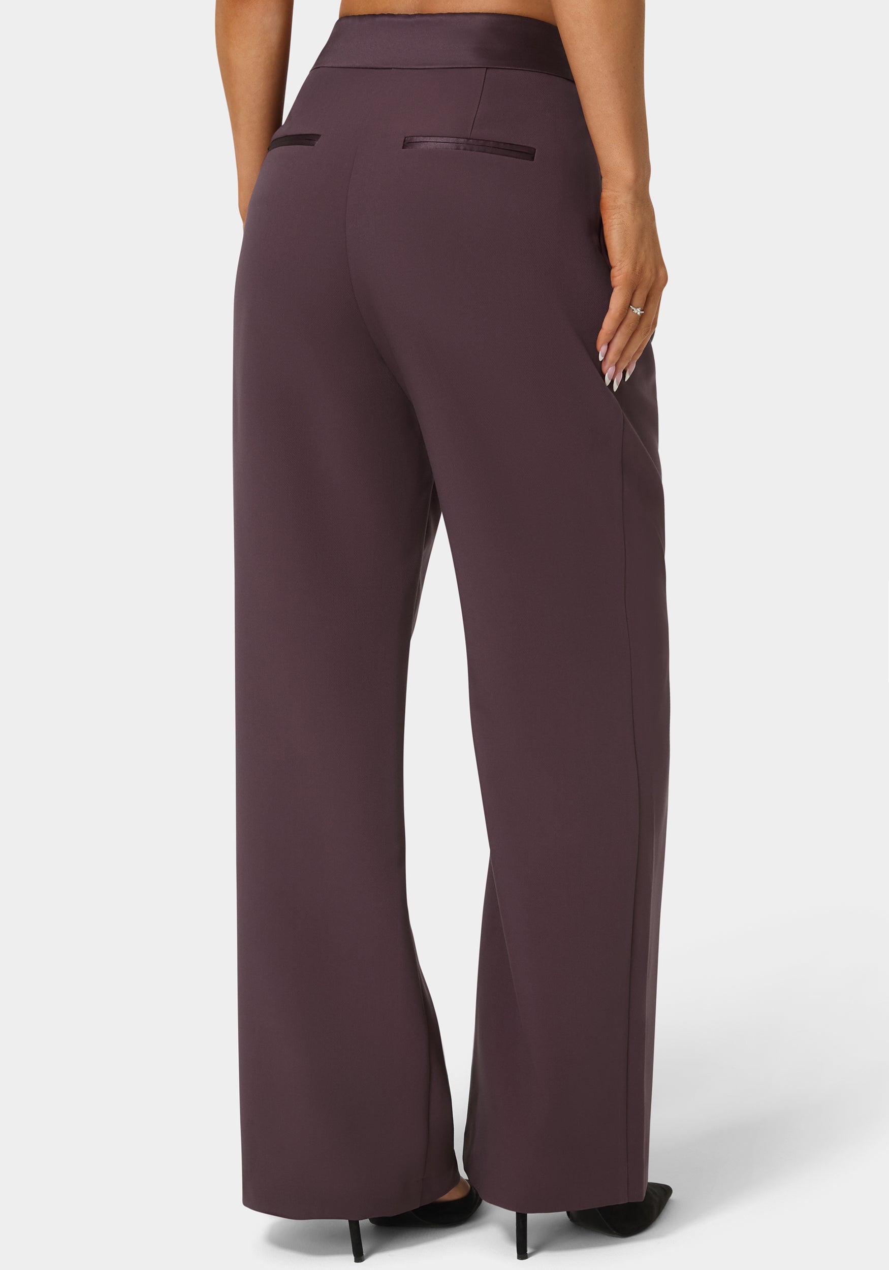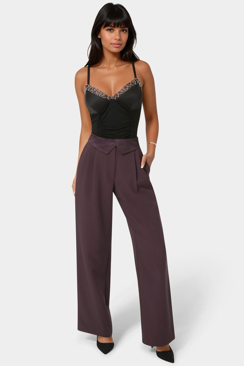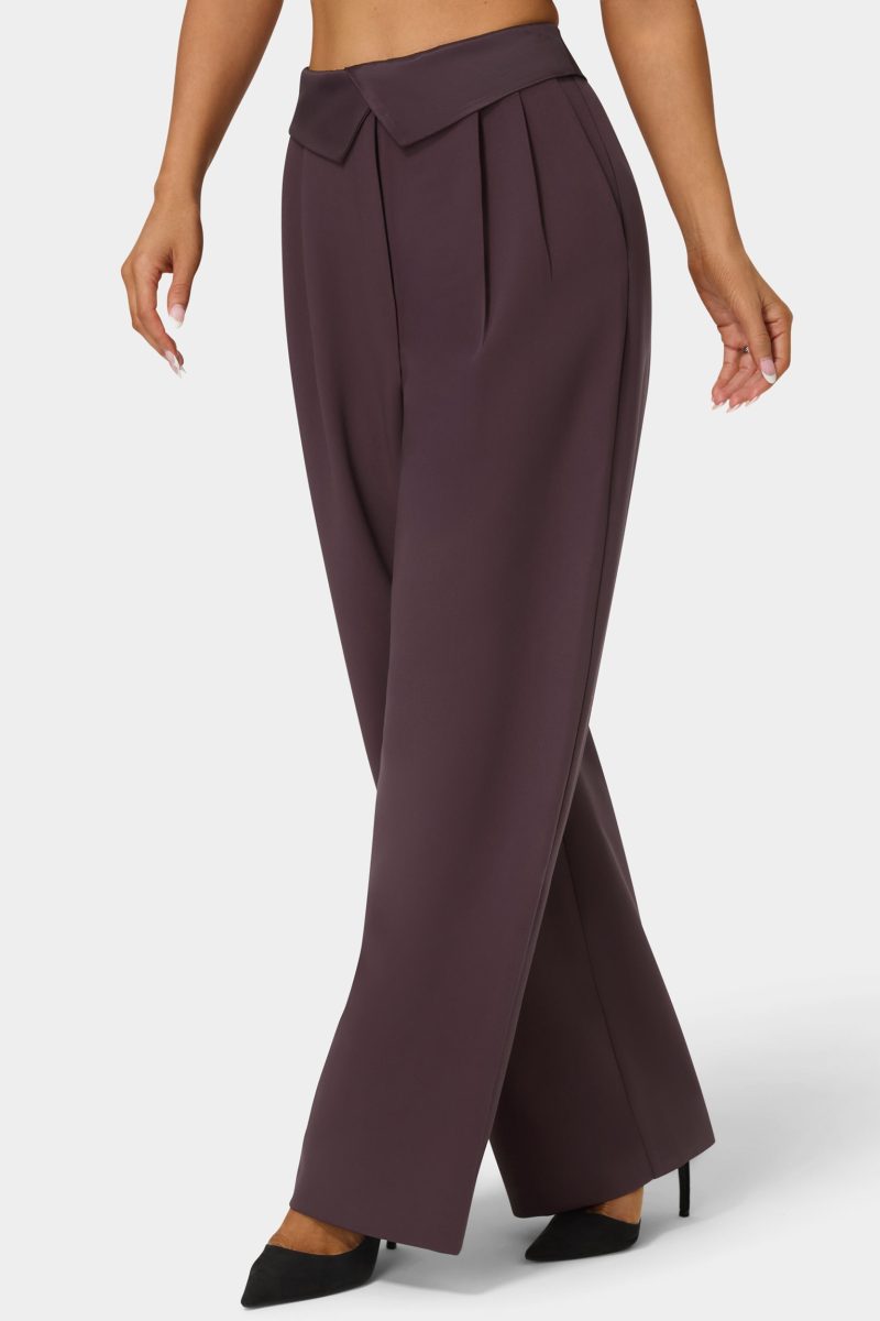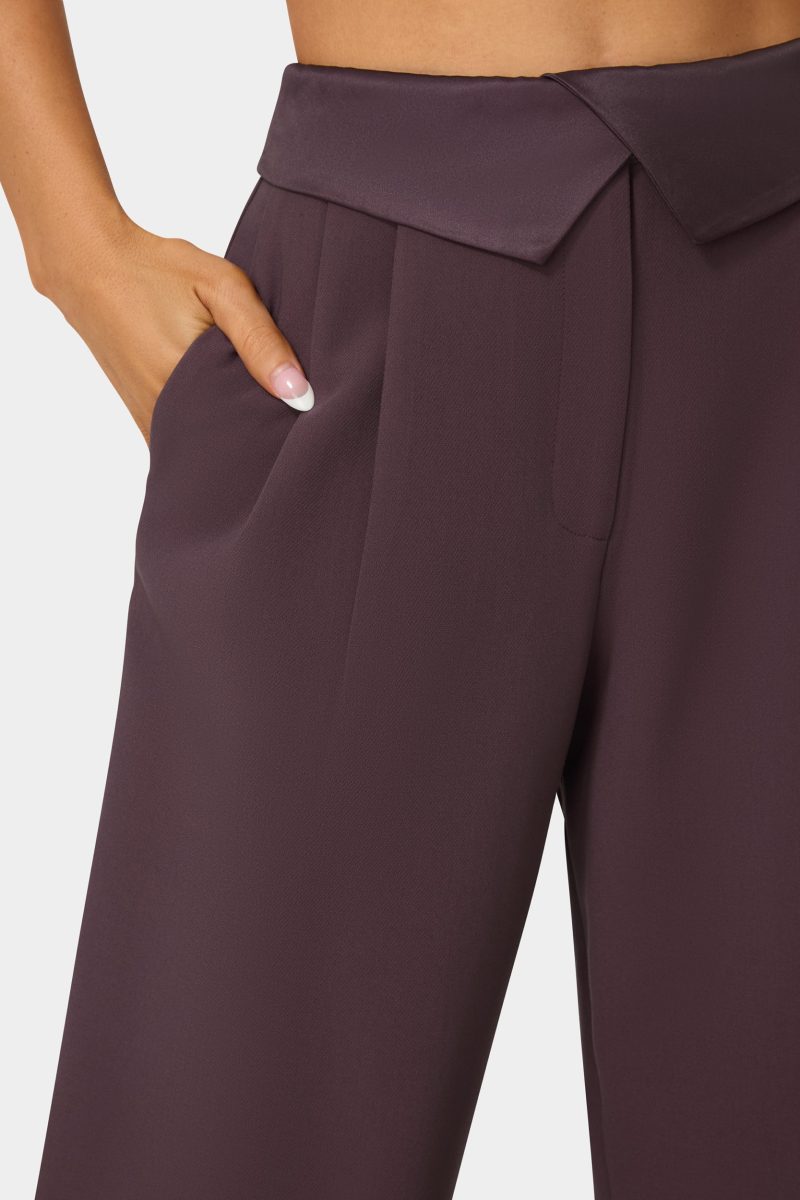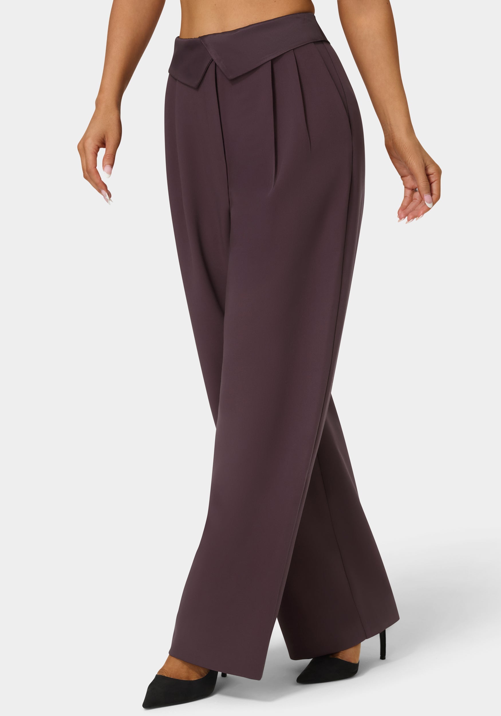 Wide-leg silhouette with folded waistband detail fits with ease for polished luncheons or professional day-to-night transitions.
