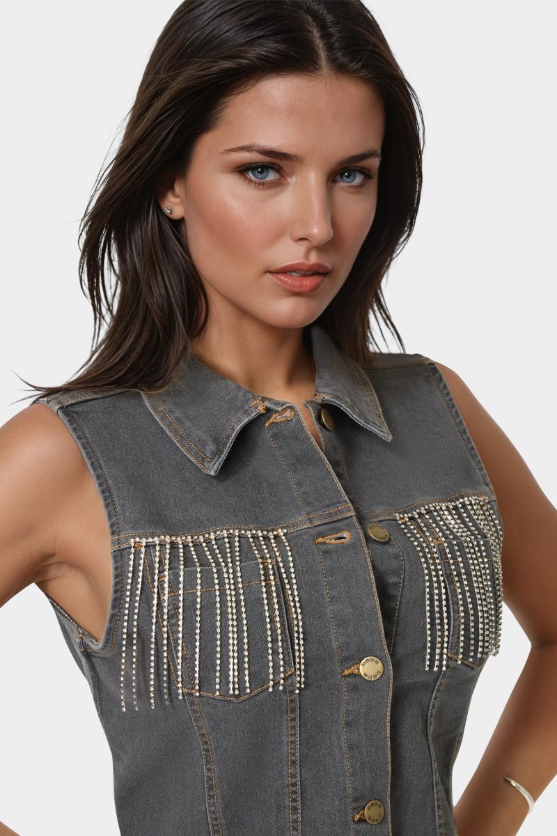 Add instant drama with this cropped vest featuring rhinestone fringe. Perfect for concerts. nights out. or when you’re craving a bold statement piece.