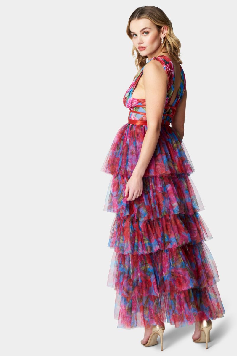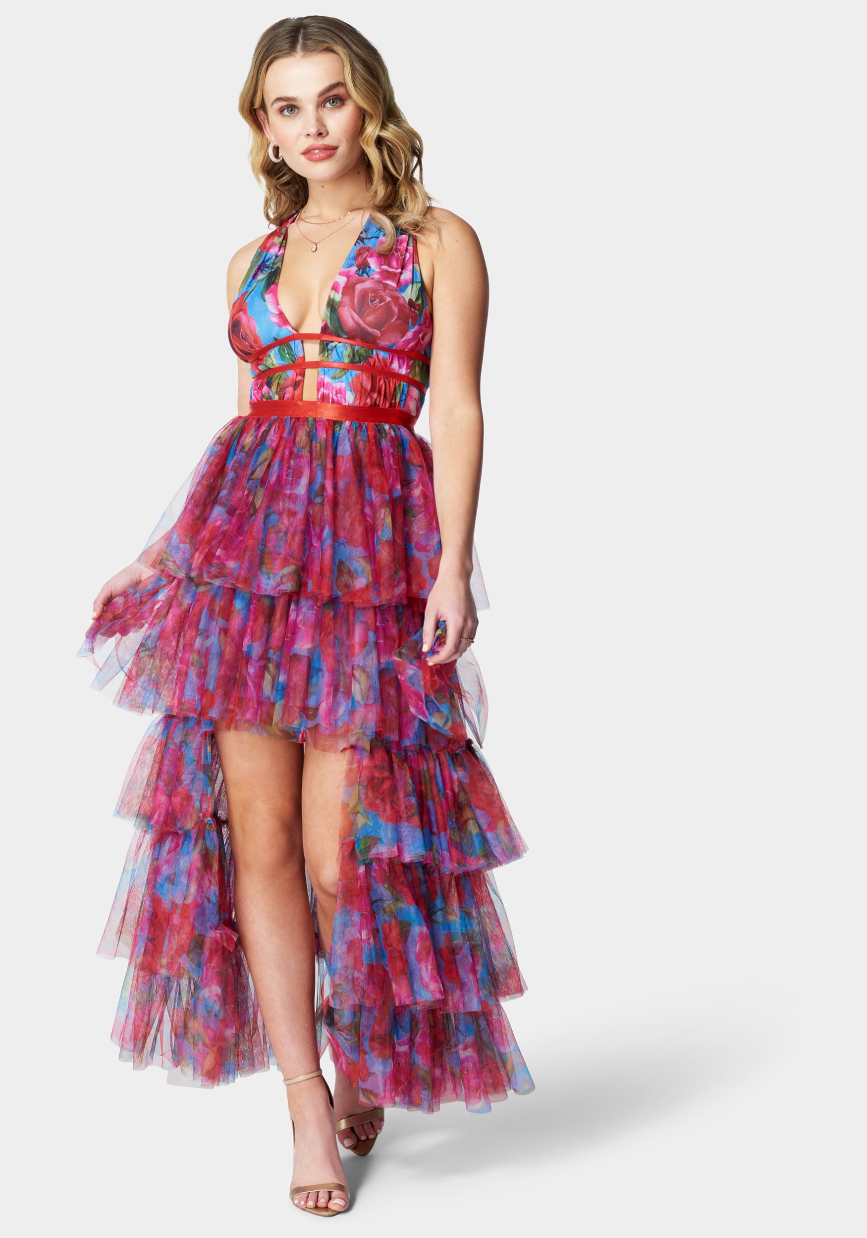 Ready for RSVP season. This gauzy mesh dress features an ornate floral print. plunging neckline. and a high low skirt with romantic tiers of tule.