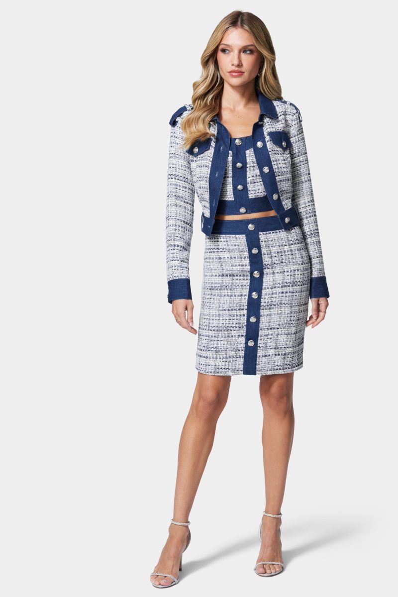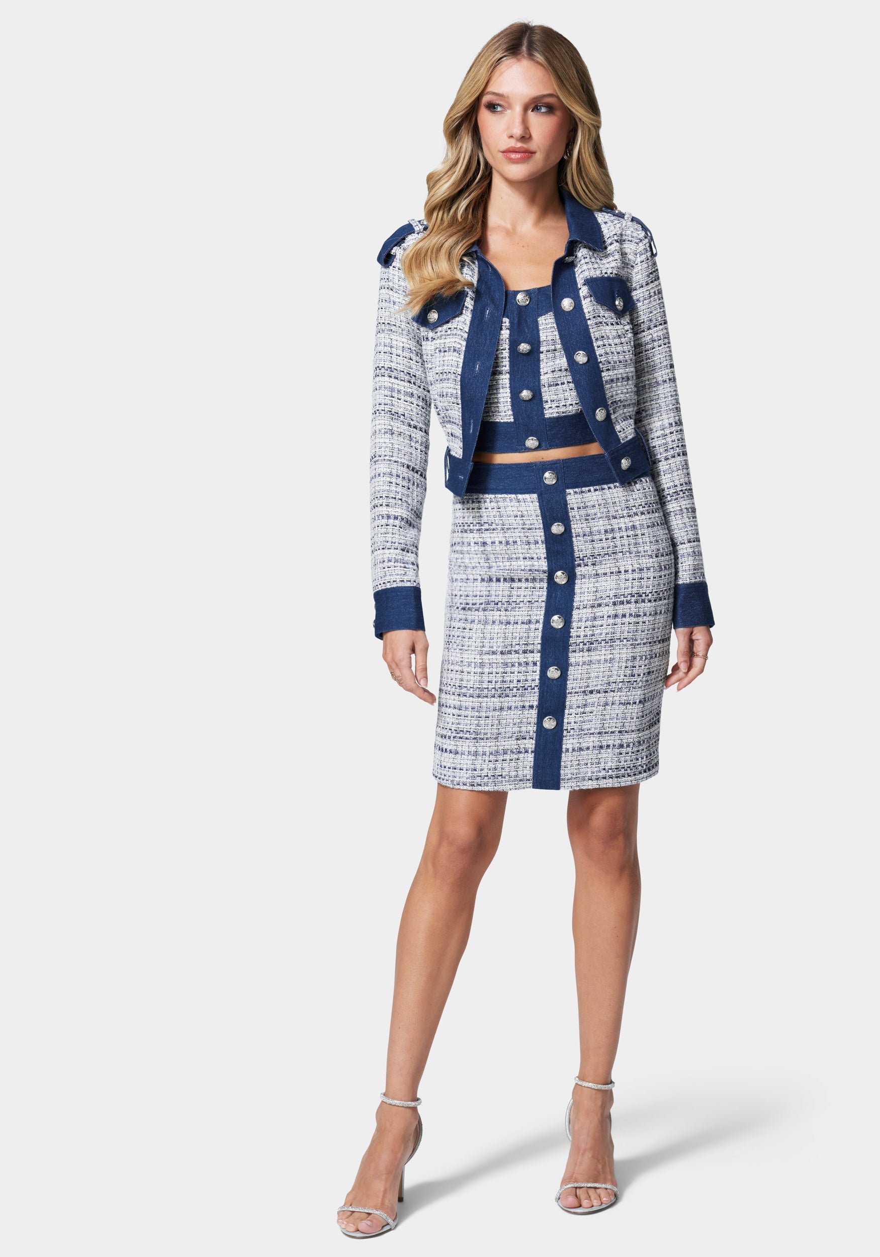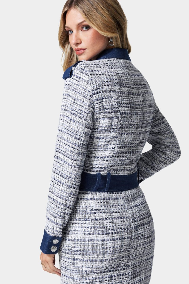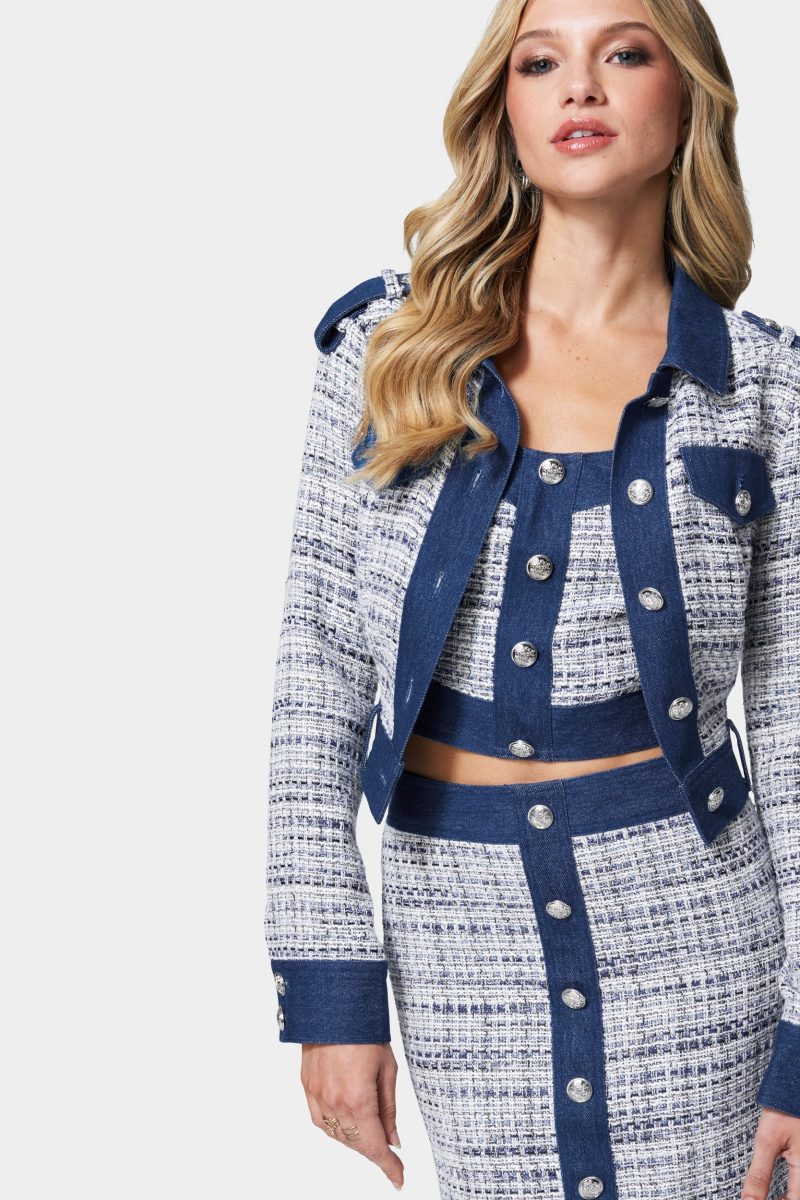 Complete your look This tweed and denim tailored jacket layers perfectly over its matching set. Featuring a cropped silhouette. polished buttons. and a structured collar.