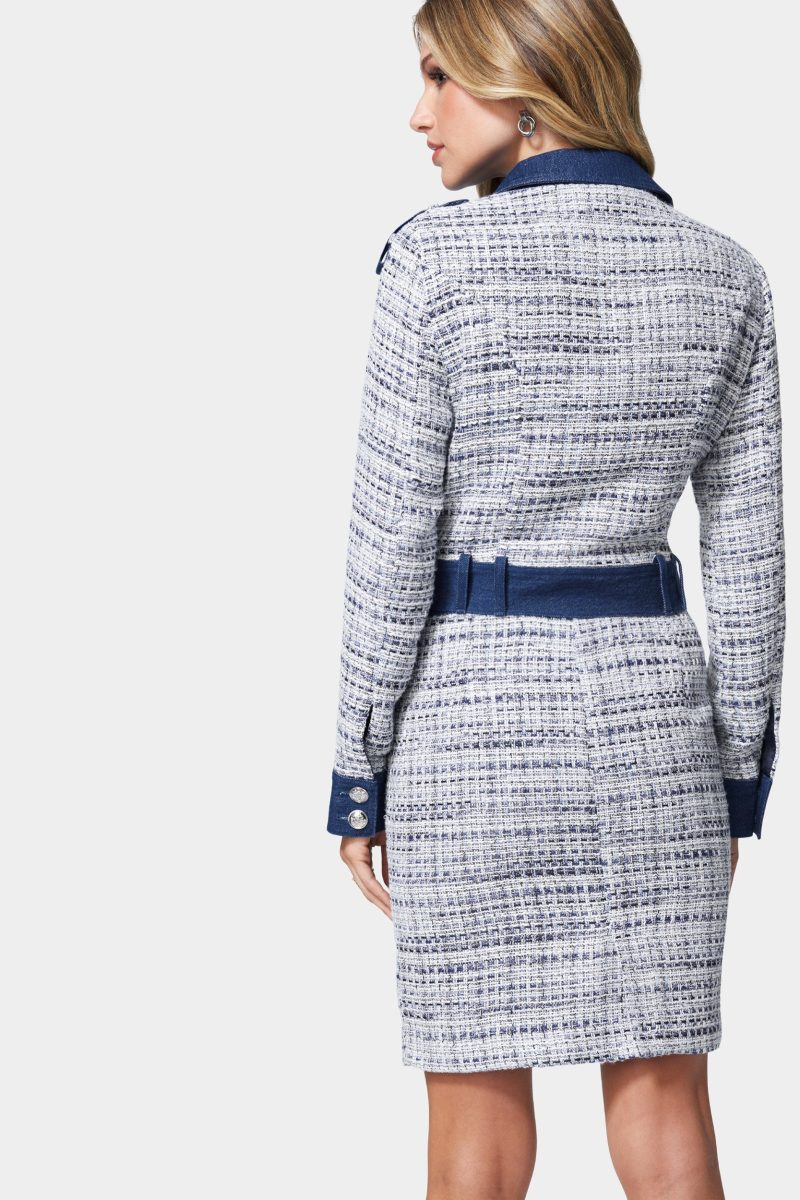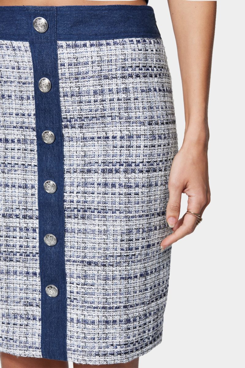 Ready for your close-up. Classic tweed and denim come together in this tailored A-line skirt. Features polished button hardware and belt loops for a refreshing take on a staple. Pair with the Tweed & Denim Button Front Bustier for a matching look.