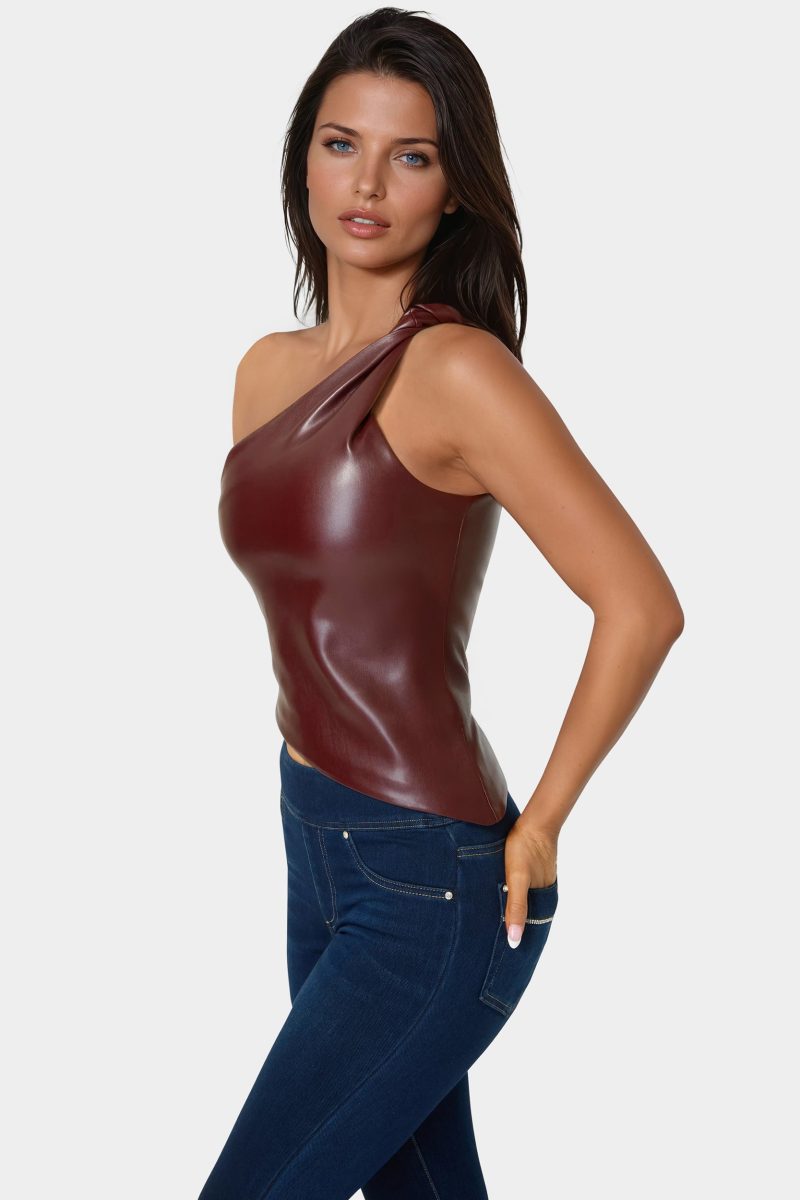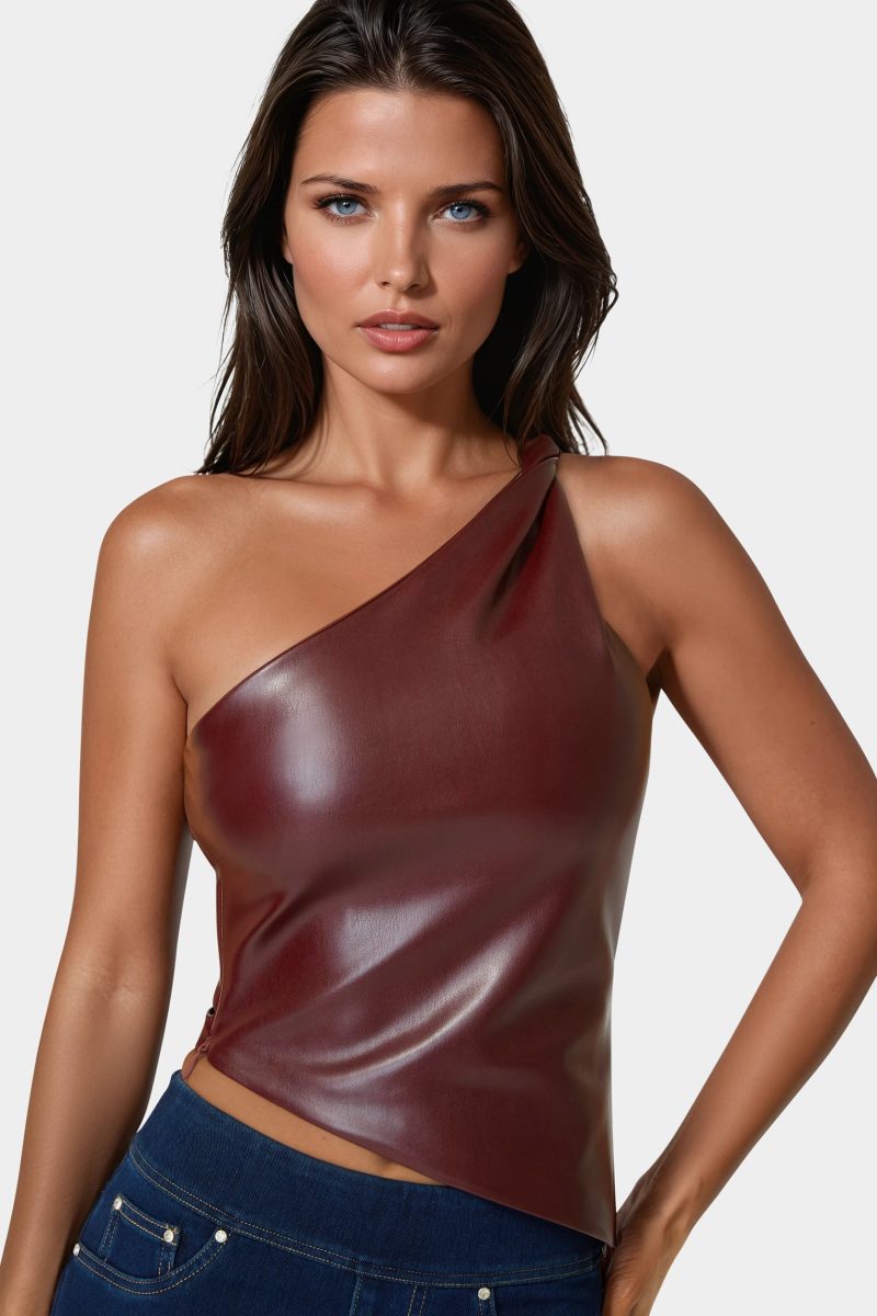 Elevate your look with this vegan leather one-shoulder top; perfect for chic events or stylish nights out.