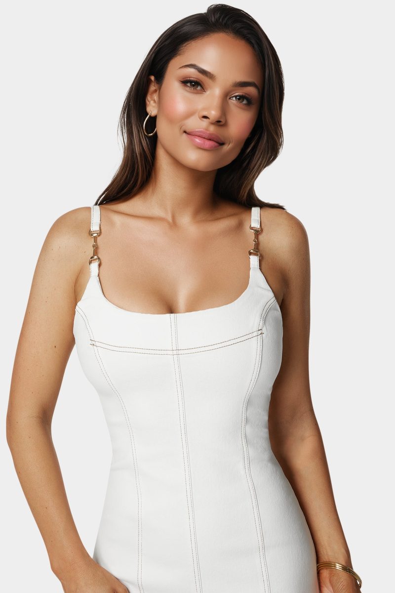Easy and elevated. this soft white denim dress walks the line between relaxed and refined. Gold hardware adds just the right amount of luxe.