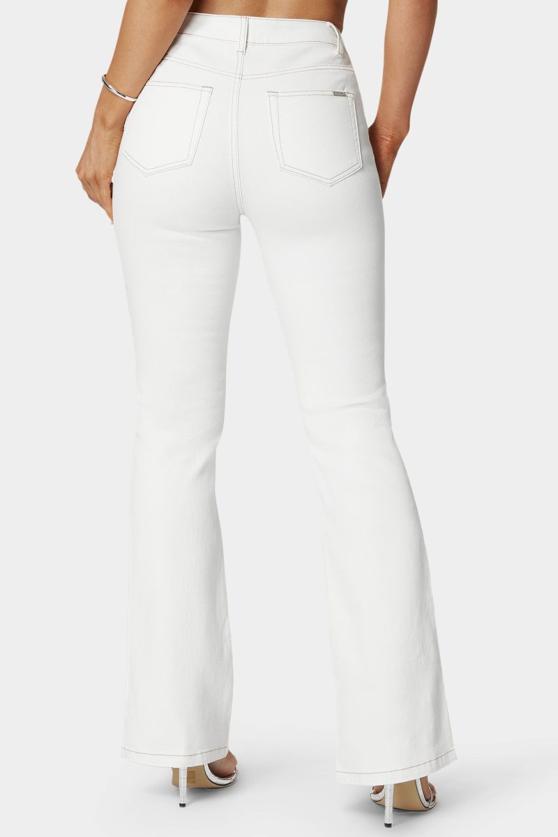Command attention in these high-waist denim essentials. The flared silhouette creates dramatic lines while the rhinestone chain details transform everyday jeans into an undeniable style statement.