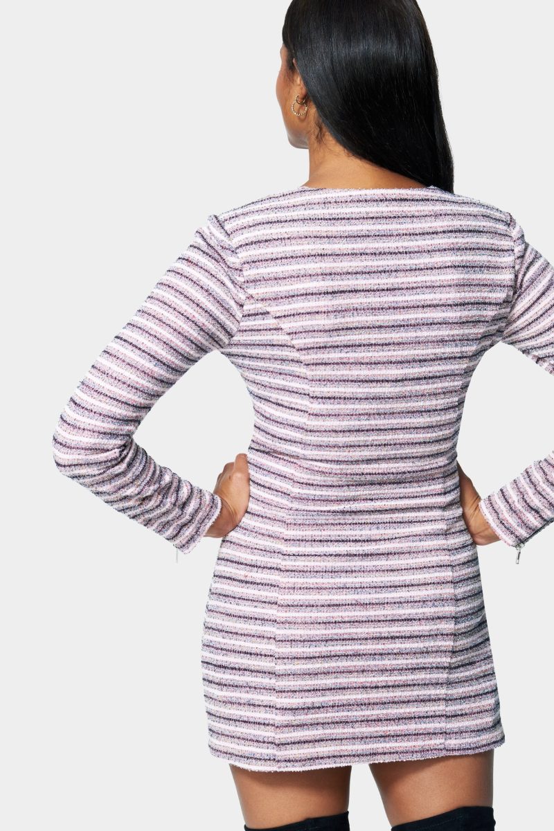 A power suit with a twist. This Zip Front Tweed Dress features a midi length and a curve-enhancing fit that can be dressed up or down.
